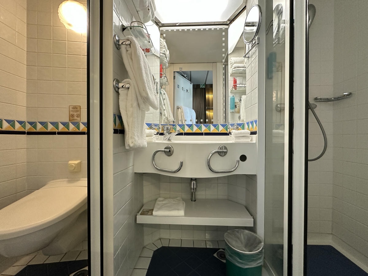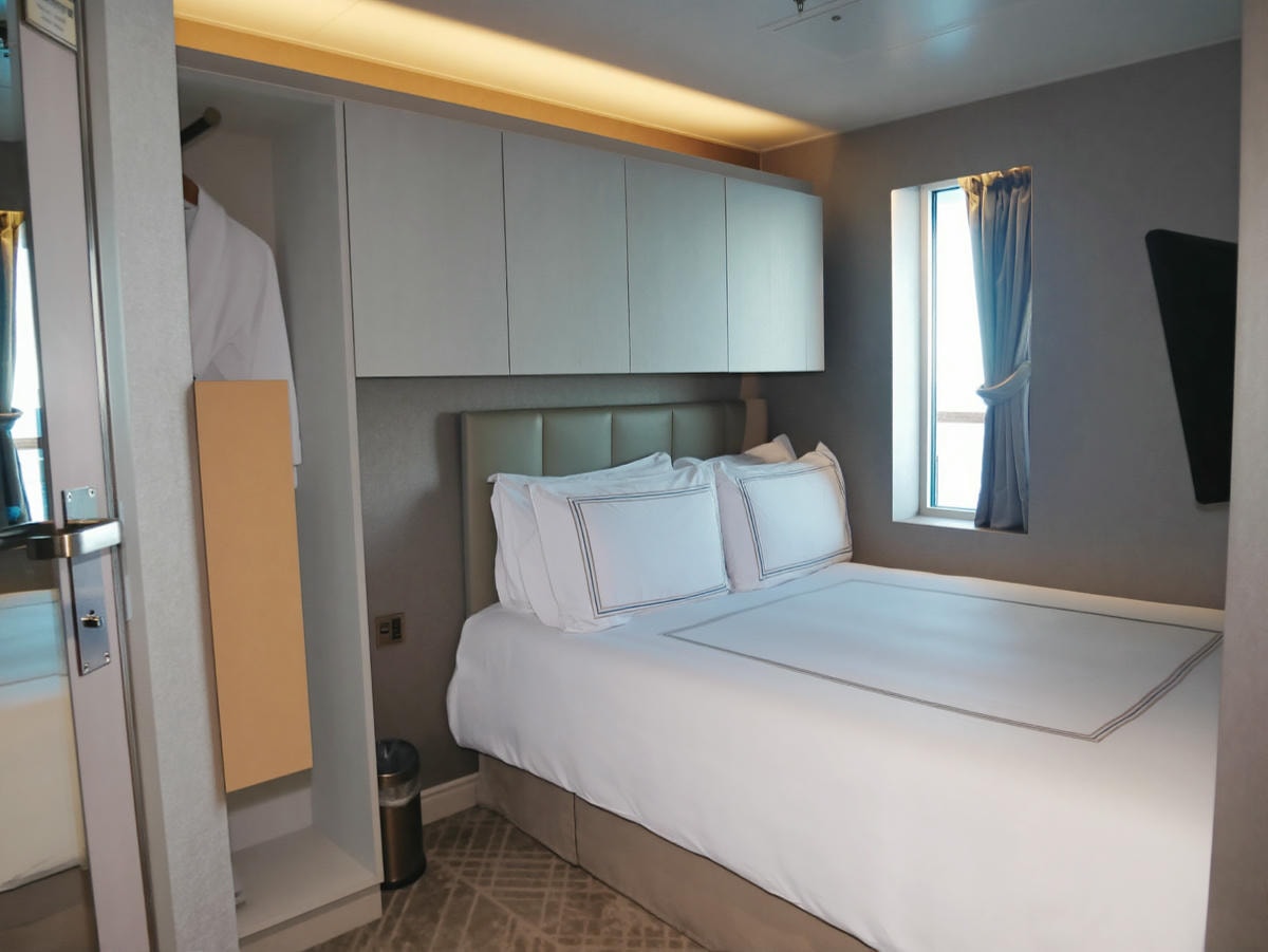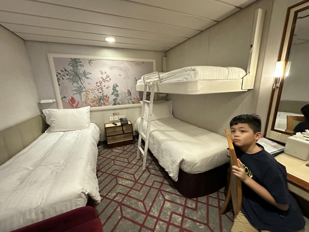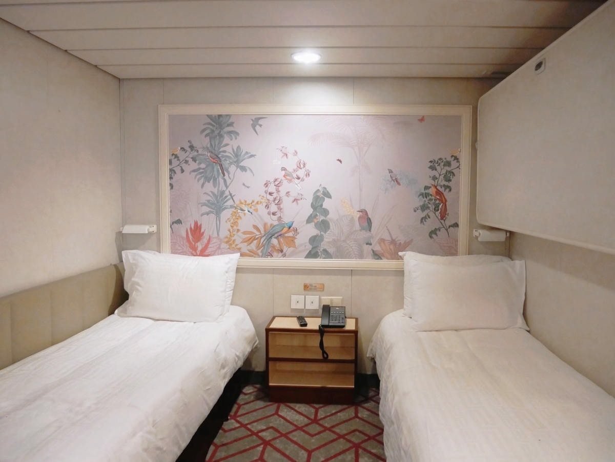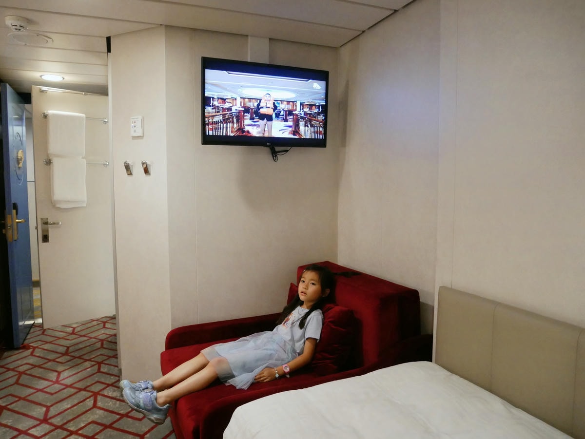 內艙房面積約12平方米,這是最經濟實惠的選擇,適合喜歡睡到自然醒,不想被陽光打擾或者只想享受郵輪設施的家庭成員。這次我們是幫長輩選兩張單人床的房型,中間走道行李箱攤開都沒有問題。